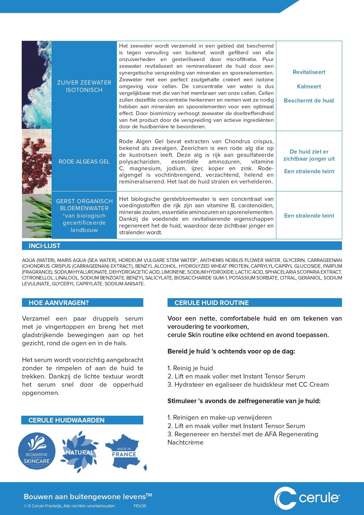 AQUA (WATER), MARIS AQUA (ZEEWATER), HORDEUM VULGARE STEELWATER*, ANTHEMIS NOBILIS BLOEMENWATER*, GLYCERINE, CHONDRUS CRISPUS EXTRACT, BENZYLALCOHOL, GEHYDROLYSEERD TARWE-EIWIT, CAPRYLYL/CAPRYL GLUCOSIDE, PARFUM (GEUR), NATRIUMHYALURONAAT, DEHYDROAZIJNZUUR, LIMONEEN, CITRUS LIMON (CITROEN) SCHILOLIE, NATRIUMHYDROXIDE, MELKZUUR, CITRUS AURANTIUM SCHILOLIE, SPHACELARIA SCOPARIA EXTRACT, PINEEN, CITRONELLOL, LINALOOL, NATRIUMBENZOAAT, BENZYLSALICYLAAT, CITRUS AURANTIUM BERGAMIA (BERGAMOT) SCHILOLIE, BIOSACCHARIDE GOM-1, KALIUMSORBAAT, CITRAL, GERANIOL, LINALYLACETAAT, NATRIUMLEVULINAAT, GLYCERYLCAPRYLAAT, POGOSTEMON CABLIN OLIE, p-ANIJZUUR.